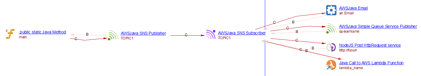 For the publish method a Java AWS SNS Publisher object is created. Its name is that of the topic. For the subscribe methods, a Java AWS SNS Subscriber object is created. Its name is that of the topic. Then for each supported protocol, an object is created with a callLink from the subscriber to that object. The supported protocols are the following: