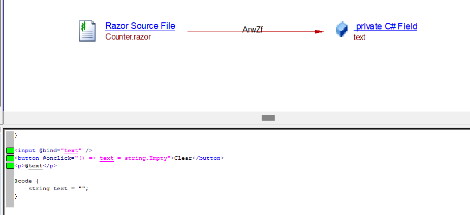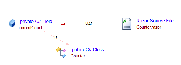 The analyzer will create an access read link from the Razor source file Counter.razor to the field: