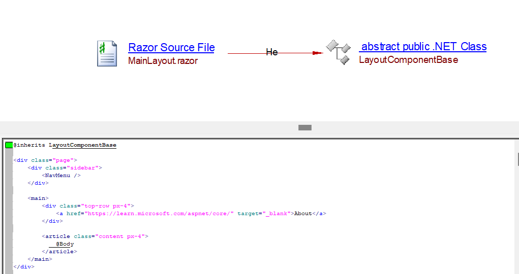 The analyzer will create a InheritExtendLink from the razor file to the class inherited (in the example LayoutComponentBase) and add the bookmark on the razor file: