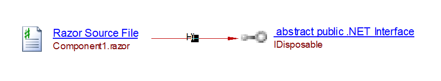 The analyzer will create a InheritImplementLink from the razor file to the interface implemented (in the example IDisposable) and add the bookmark on the razor file: