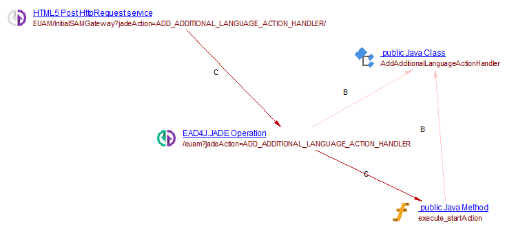 - In actionHandler.xml, provides the jadeAction parameter url part (in the examples above this is “/euam?jadeAction=ADD_ADDITIONAL_LANGUAGE_ACTION_HANDLER”), with the associated class (in the examples above this is “com.att.uam.ui.jade.action.AddAdditionalLanguageActionHandler”).