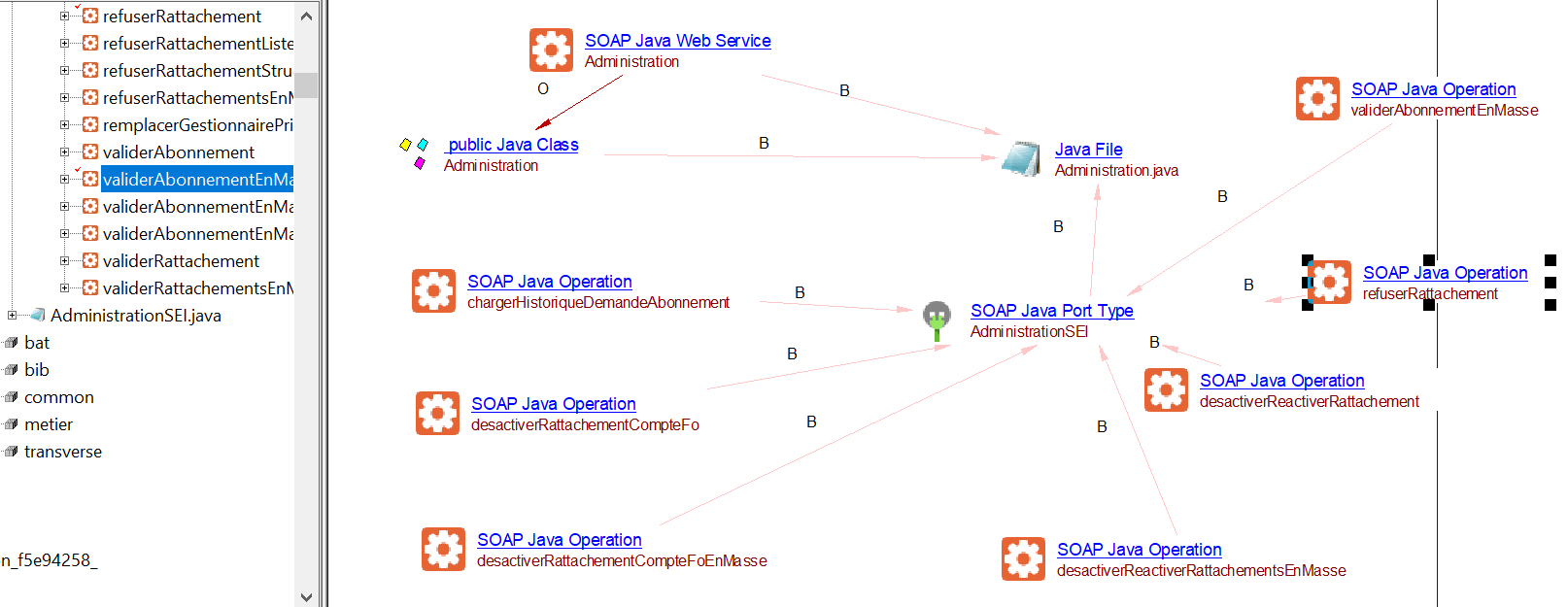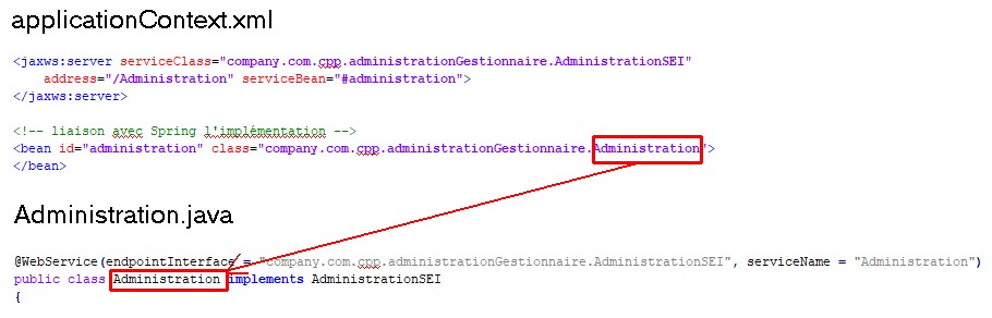 In the example below, the serviceBean is “#administration” and administration is mapped to the implementing class cpp.administrationGestionnaire.Administration. The required objects and links for the class Administration should be created during an analysis.