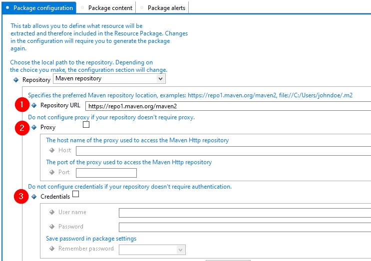 - The Package Configuration tab then offers the following interface to access your Maven repository: