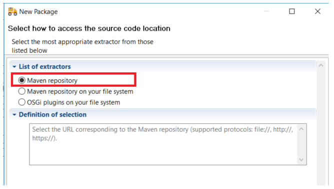 - This extractor supports remote Maven repository as well as Maven repository on your file system. The URL format must use the http/https/file protocol.