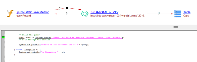 Query query = context.query("insert into cars values(100,'Hyundai','verna',2016,1500000)");
