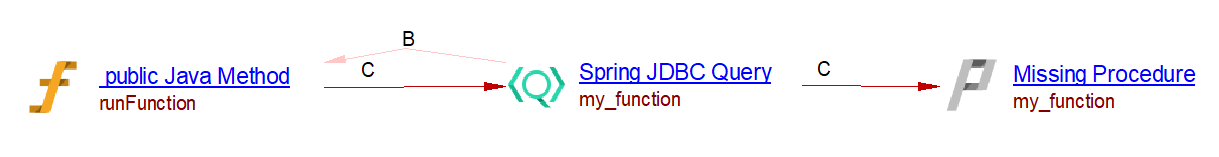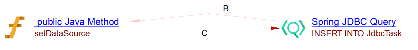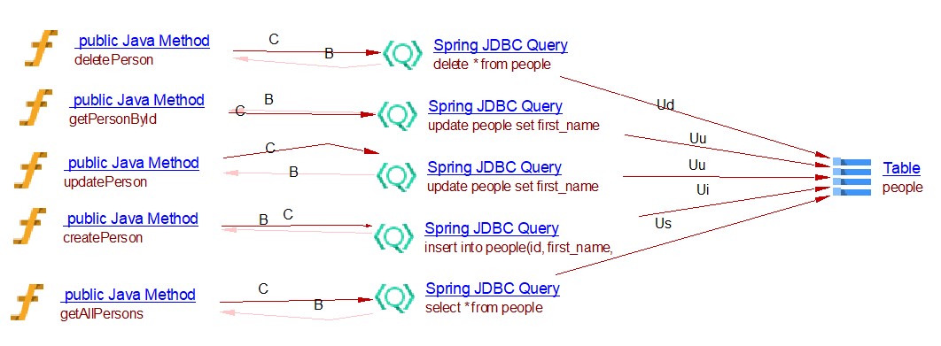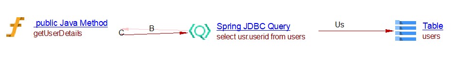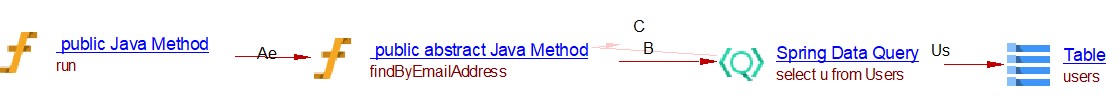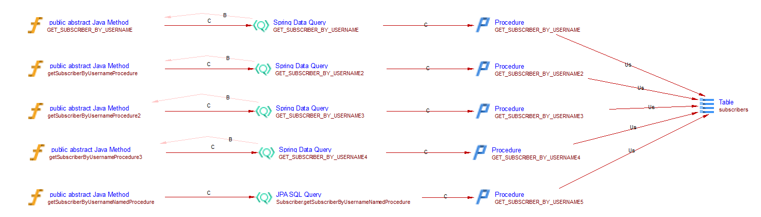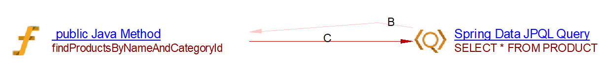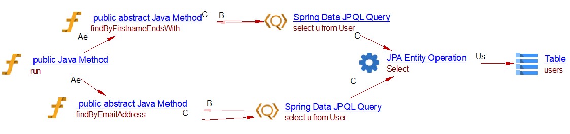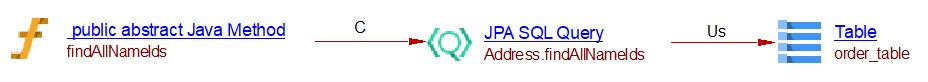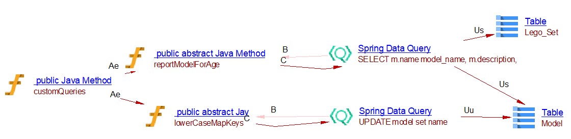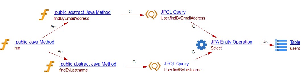 This spring data extension will create the links between objects that are created by the JEE analyzer (the JAVA Methods). For CRUD function calls and queries by inference links to entities handled by com.castsoftware.java.hibernate are created. In the case of database queries, if native queries or JDBC queries are invoked, Spring Data Query objects and respectively Spring JDBC Query objects are created and SQL Analyzer will handle the link to the table. In the case of the JPQL queries the extension creates Spring Data JPQL Query objects. The queries are registered for Java Persistence Framework and are handled by com.castsoftware.java.hibernate extension to create links to entity operations.