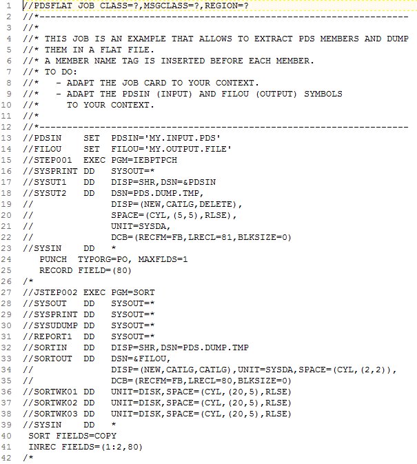 It is possible to dump the content of a PDS in a flat file where each member is preceded by a specific banner. This operation is performed by executing a dedicated tool (IEBPTPCH) through a JCL job (you can download this file here (note this is a ZIP file that contains the JCL file)). The resulting file can be then transferred onto the analysis server ready for delivery via the Delivery Manager Tool.