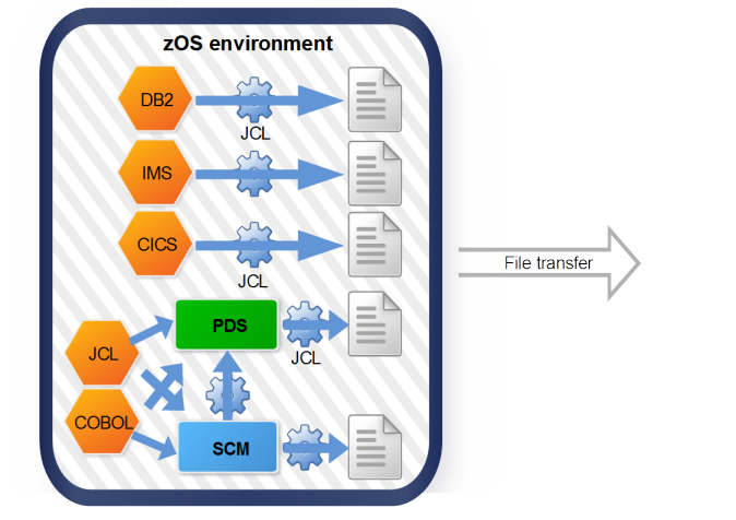 Program and copybook source files can either be managed in a Partitioned Data Set (PDS) or in a Source Code Manager (SCM) like Endevor. In both cases, resulting files are transferred by using the FTP protocol and this operation can be automated through a dedicated JCL job or by adding a last step in JCL job used to extract the source code as described below.
