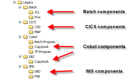 A Mainframe application is often based on several types of components such as programs, JCL jobs, databases, files, transactions, maps etc.