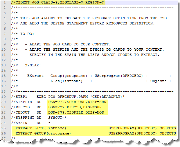 This resource definition can be delivered via a copy (into an ASCII flat file) of the script used to define the CICS environment or by using a JCL in order to extract this information from CICS. The following JCL is shown as an example. If you want to use it, then you have to configure it according to the norms used in the execution environment and then you must specify the lists or the groups of CICS objects to collect (please note that you cannot specify a list and a group on the same command). The application owners and/or CICS administrators are best placed to help you retrieve the information you need.