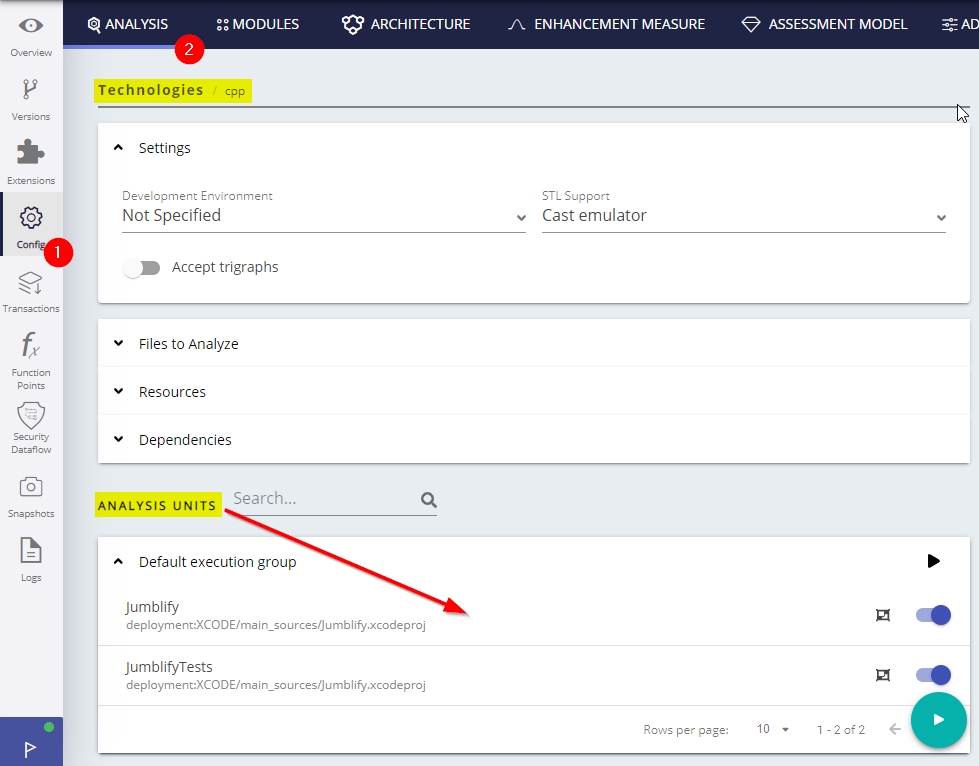 A discoverer (see com.castsoftware.dmtxcodediscoverer) is provided with the extension to automatically detect Xcode code: CAST will search for the project.pbxproj (or a .pbxproj file) - when one is found, the contents are inspected and are used to determine the list of projects present in the root folder. For every Xcode project located, one C/C++ Technology Analysis Unit will be created: