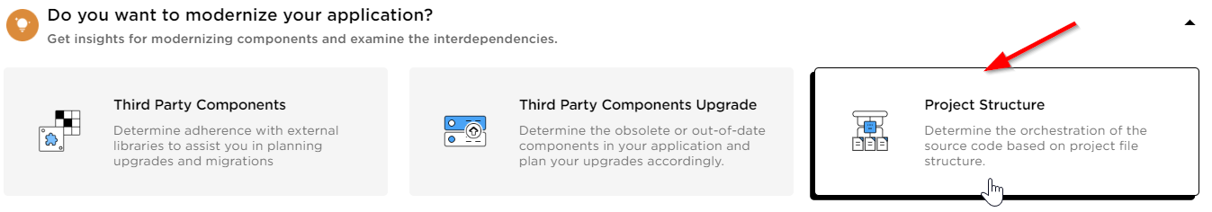 The Welcome page in CAST Imaging also includes a dedicated tile which will open the Project Structure scope: