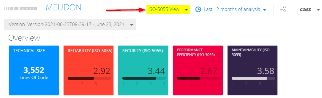 This documentation explains how to modify the default tiles in the ISO-5055 view provided out of the box in the CAST Health Dashboard to use different ISO-5055 metrics. The ISO-5055 view is accessed using the drop down available at single or multi-application level: