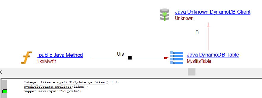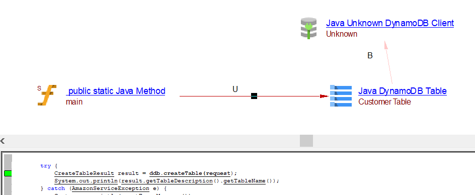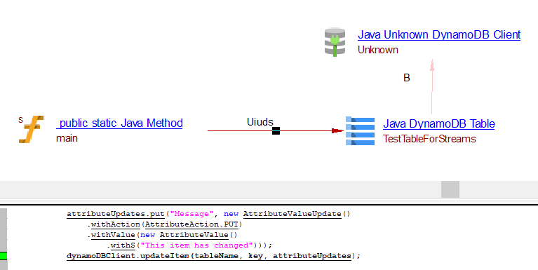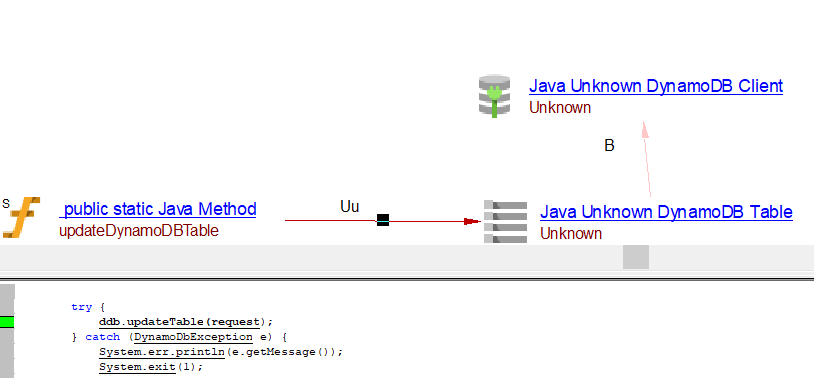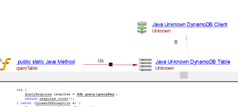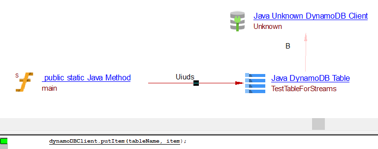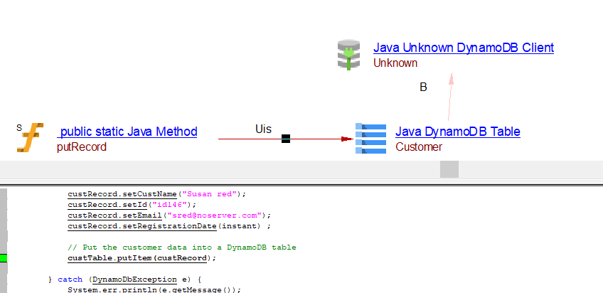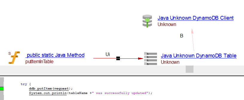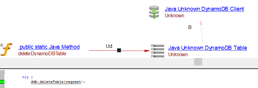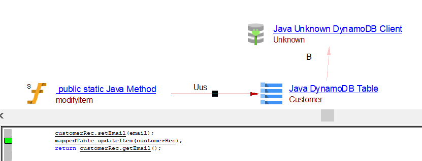 | useInsertLink | Between the caller Java Method objects and Java AWS DynamoDB table object | batchWriteItems, transactWriteItems may result in useInsertLink, useUpdateLink or useDeleteLink depnding on the usage. | ||||