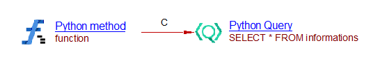 The analyzer creates a Python Query object with name *SELECT * FROM informations *(first 4 words are only used as naming convention) representing a call to a database. Provided analysis dependencies between SQL and Python are configured in CAST Management Studio, the analyzer will automatically link this object to the corresponding Table object, in this case informations, that has been generated by a SQL analysis unit.