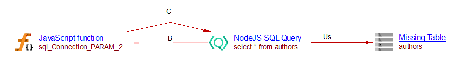 In this example, a ‘NodeJS SQL Query’ object is created and a ‘call’ link between the function ‘sql_Connection_PARAM_2’ and that query is added. The SQL Analyzer or Missing tables and procedures for Node.js can then link that query with the corresponding table. In the situation described above, this extension creates a ‘useSelect’ link to the missing table ‘authors’: