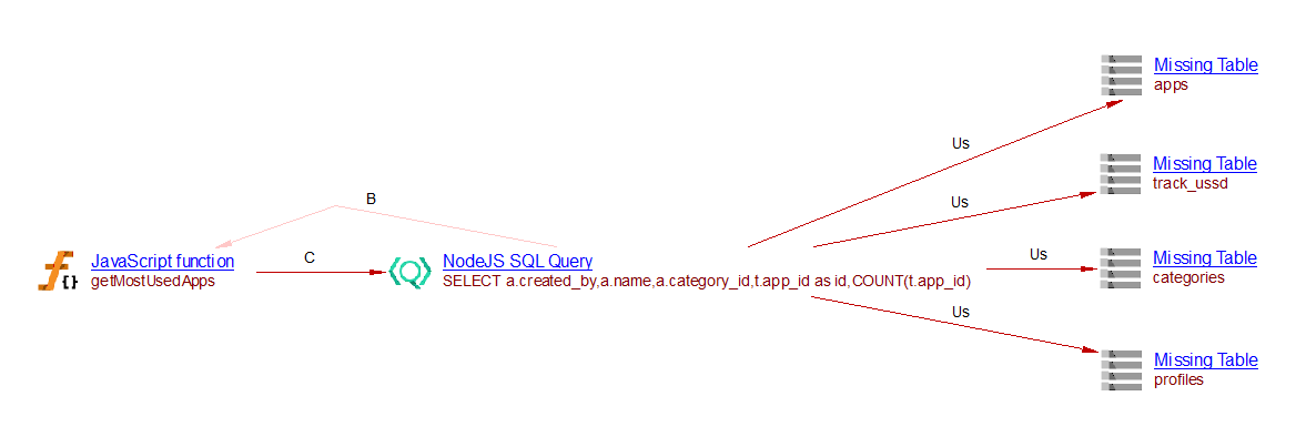 In this example, a ‘NodeJS SQL Query’ object is created and a ‘call’ link between the function ‘getMostUsedApps’ and that query is added. The SQL Analyzer or Missing tables and procedures for Node.js can then link that query with the corresponding table. In the situation described above, this extension creates four ‘useSelect’ links to the four missing tables: