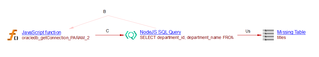 In this example, a ‘NodeJS SQL Query’ object is created and a ‘call’ link between the function ‘oracledb_getConnection_PARAM_2’ and that query is added. The SQL Analyzer or Missing tables and procedures for Node.js can then link that query with the corresponding table. In the situation described above, this extension creates a ‘useSelect’ link to the missing table ’titles’: