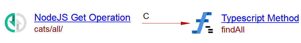 The analysis of the following code will create a Node.js Get Operation named cats/all/ with a call link from the operation to the handler method findAll. The URL corresponds to the concatenation of the argument of the @Controller decorator with that of the @Get decorator of the method. The decorator of each method defines the type of the operation.