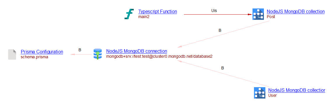In this example, a ‘NodeJS MongoDB connection’ and two ‘NodeJS MongoDB collection’ objects are created. This extension creates a ‘useInsert’ and a ‘useSelect’ links from the function ‘main2’ to the collection ‘Post’: