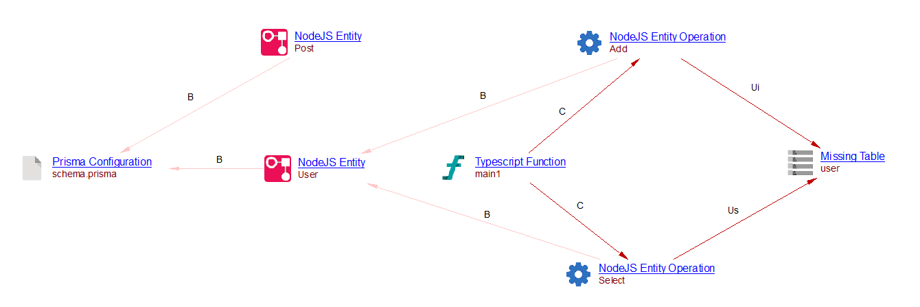In this example, two ‘Node.js Entity’ and two ‘Node.js Entity Operation’ objects are created and two ‘call’ links between the function ‘main1’ and these entity operations are added. The SQL Analyzer or Missing tables and procedures for Node.js can then link these entity operations with the corresponding table. In the present case, this extension creates a ‘useInsert’ and a ‘useSelect’ links to the missing table ‘user’: