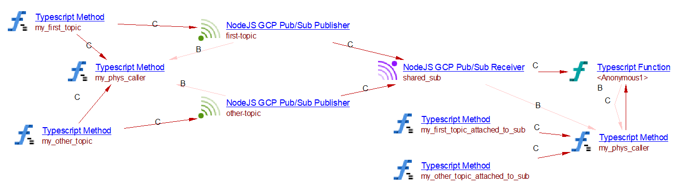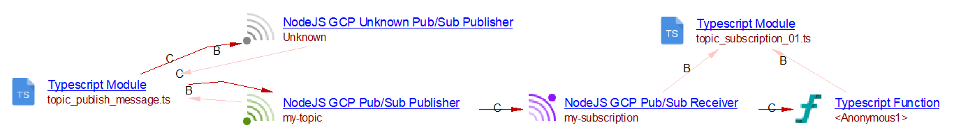 This extension, when the Node.js client library for Google Pub/Sub is found in the source code, may create the following objects representing message publishers and message receivers: